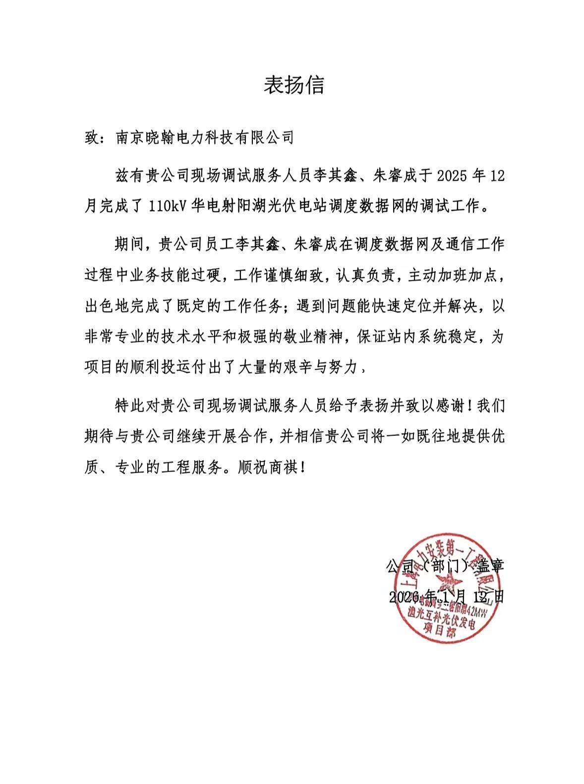 近日,我司收到上海电力安装******工程有限公司发来的表扬信,信中对我司员工李其鑫、朱睿成在扬州宝应射阳湖42MW集中式光伏项目调度数据网调试工作中的卓越表现给予高度肯定。项目方在信中特别感谢两位员工的辛勤付出,期待与我司持续深化合作。这份认可不仅是对个人的褒奖,更是对我司技术服务能力的认可和信任。客户的褒奖是我们不断前进的动力。未来,晓翰电力将继续秉持专业精神,更严格的标准,用心实施好每一个项目。感谢项目方的认可,也感谢每一位在岗位上默默奉献的晓翰人!